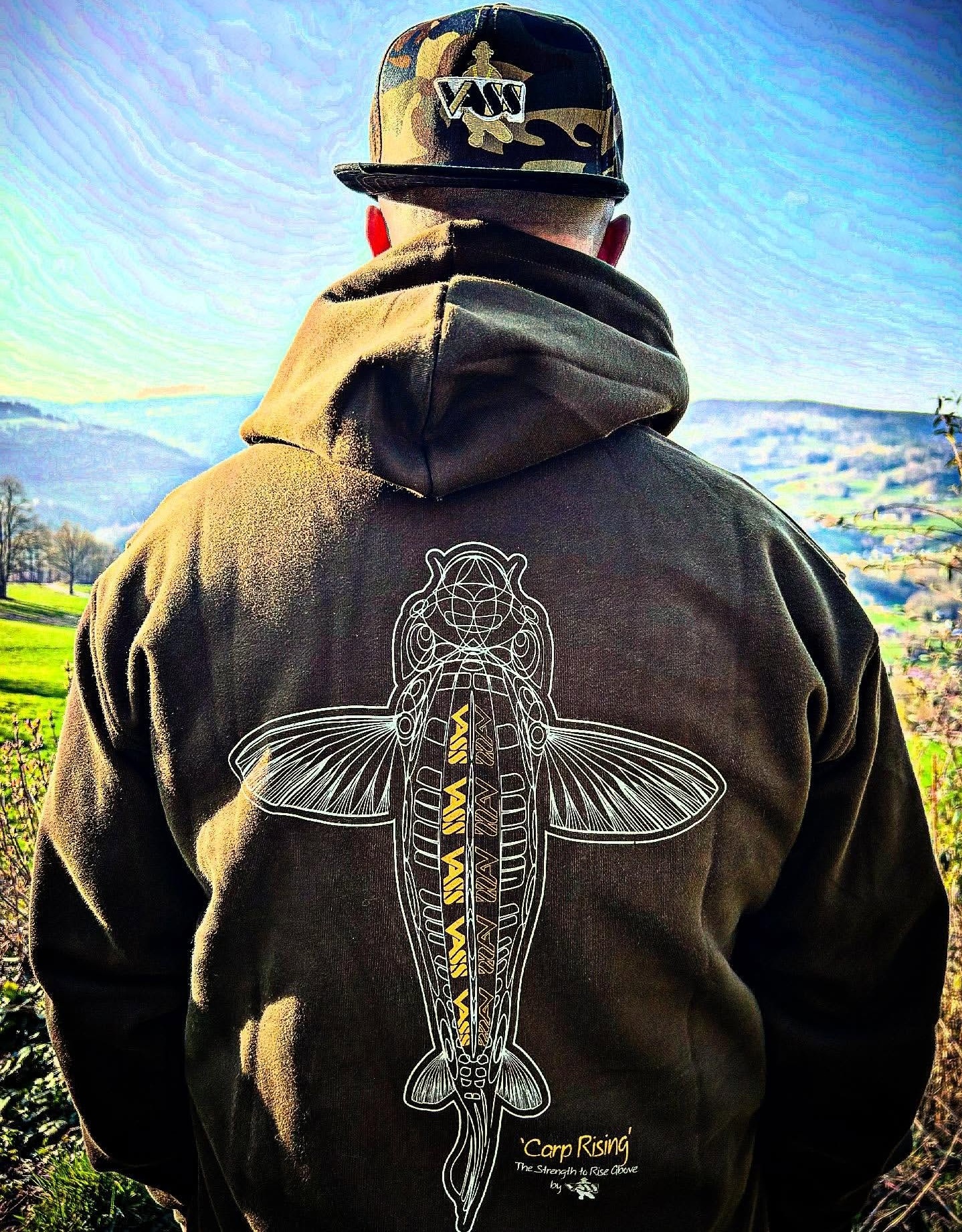 The Vass 'Carp Rising' design illustrates 'The Strength to Rise Above' The enlarged Pectoral fins represent wings taking flight to ‘Rise Above’. The slogan includes 'The Strength’ relating to the inner strength needed to keep pushing even when times get tough, believing that you have the strength to 'Rise Above’ and succeed. This not only relates to fishing but also the journey of life itself!
